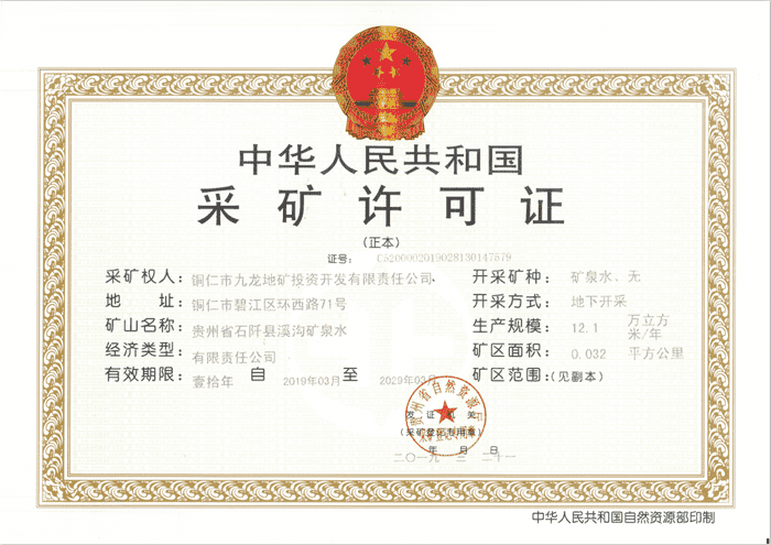 3月21日,我公司順利取得銅仁石阡年產(chǎn)10萬(wàn)噸富鍶礦泉水項目(以下簡(jiǎn)稱(chēng)石阡泉都礦泉水項目)采礦許可證。證照注明,采礦權人為銅仁市九龍地礦投資開(kāi)發(fā)有限責任公司,礦山名稱(chēng)為貴州省石阡縣溪溝礦泉水,開(kāi)采礦種為礦泉水……