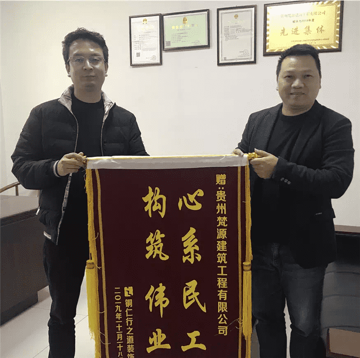 2019年11月19日下午,銅仁行之道裝飾公司工作人員將印有“心系民工、共筑偉業(yè)”的錦旗送到梵源建筑公司,代表行之道裝飾公司對梵源建筑公司在銅仁市花果山職工食堂維修改造項目施工過(guò)程中給予的悉心指導和殷切關(guān)懷表……